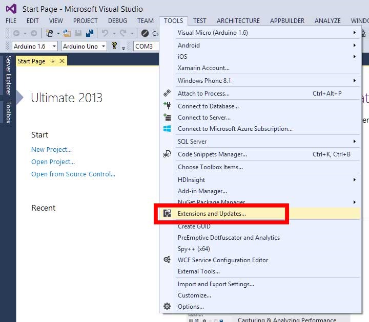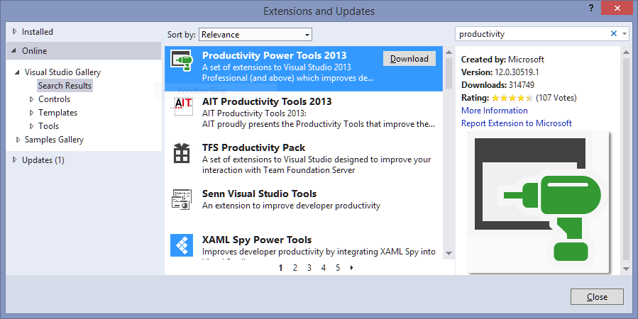 You can install it from the page in the Visual Studio Gallery but the easiest way is to just have Visual Studio kick off the process for you. Select “Extensions and Updates” in the Tools menu.