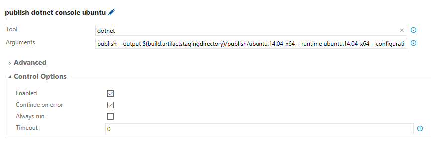 - Set the Arguments to “publish –output $(build.artifactstagingdirectory)/publish/ubuntu.14.04-x64 –runtime ubuntu.14.04-x64 –configuration Release”