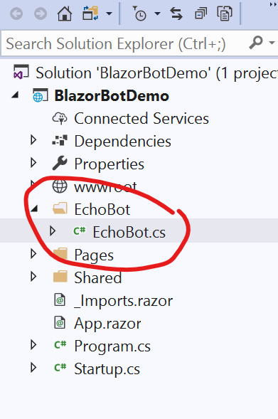 Create a folder in the project named “Bot” and create a new class “EchoBot” in that folder. Copy the EchoBot code from the sample https://github.com/Microsoft/BotBuilder-Samples/blob/master/samples/csharp_dotnetcore/01.console-echo/EchoBot.cs