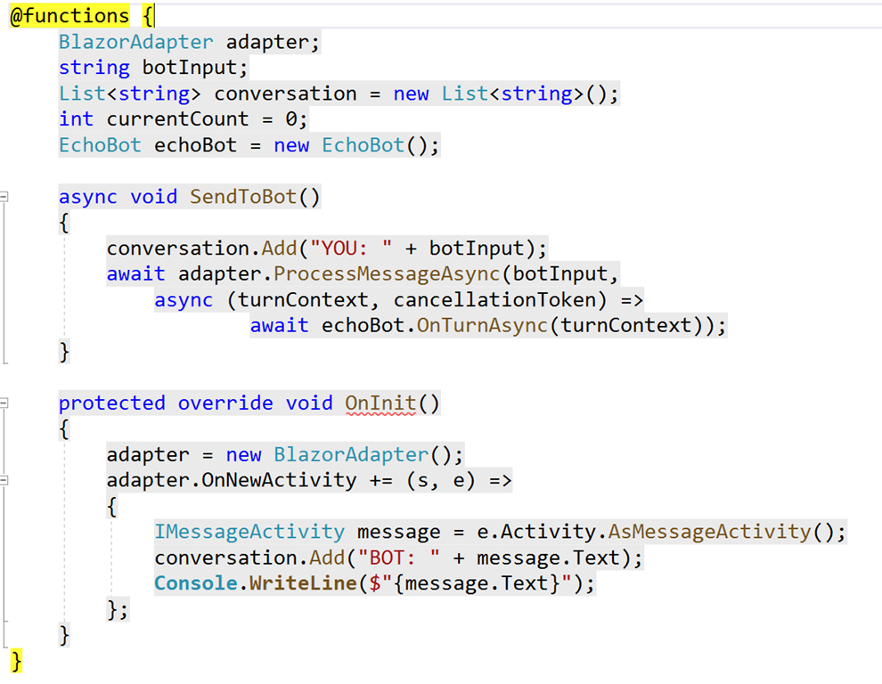 The SendToBot function is invoked when the user clicks the button. At that time we take the string from the textbox and tell the adapter to process it, sending it to the bot.
