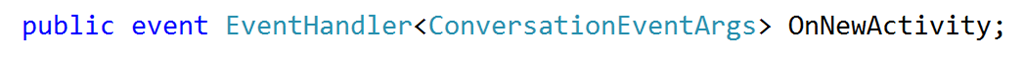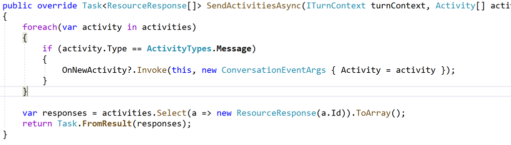 • SendActivitiesAsync – this is invoked whenever the bot sends activities back to the client. We will use it to raise an event to notify the client UI a new activity is available.