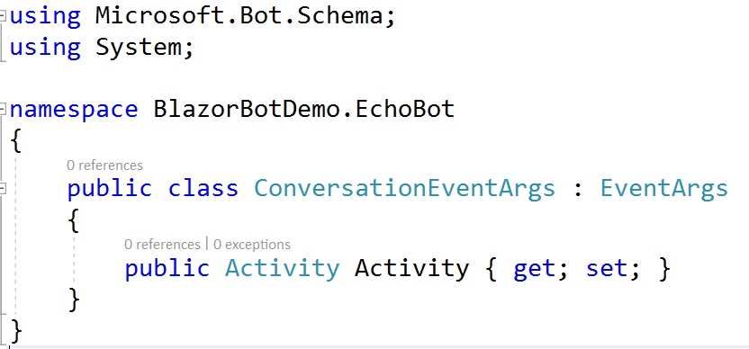 First we need to add the bot assembly references to the app. Bot framework v4 is built on .NET Standard 2.0 libraries so they will run inside Blazor (mostly). Use NuGet to add a reference to Microsoft.Bot.Builder v4.x. Now when you build the app you may get an error similar to