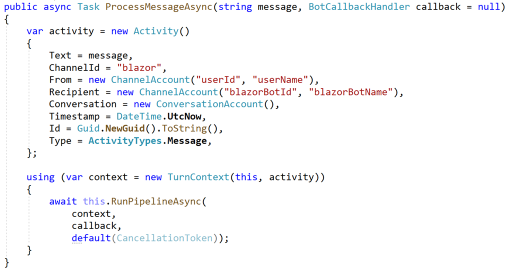 Now add a method to the adapter called ProcessMessageAsync which we will use to send messages to the bot. It looks like this