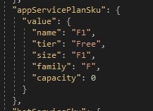 We can change that by overriding it in the parameters file by including a new “appServicePlanSku” object with the plan we want to use – the Free (F0) plan.