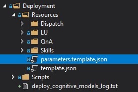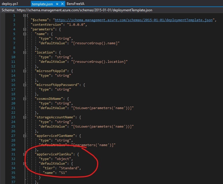 The VA template deploys its resources via an ARM template and you can supply a parameters file to the deployment script to change how that deployment happens. The thing I was interested in recently was deploying to the smallest and least expensive dev/test instances of the various services in order to keep the cost down. Since this was just for demo purposes and I would be the only one talking to the bot, I didn’t need the capacity and scale of the default install.