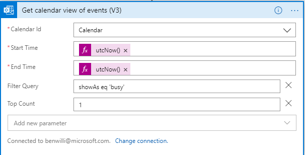 Next I need to check for the status of the calendar events. I need to query for any “show as busy” meetings at the scheduled times. Use the Get Calendar View of Events for this