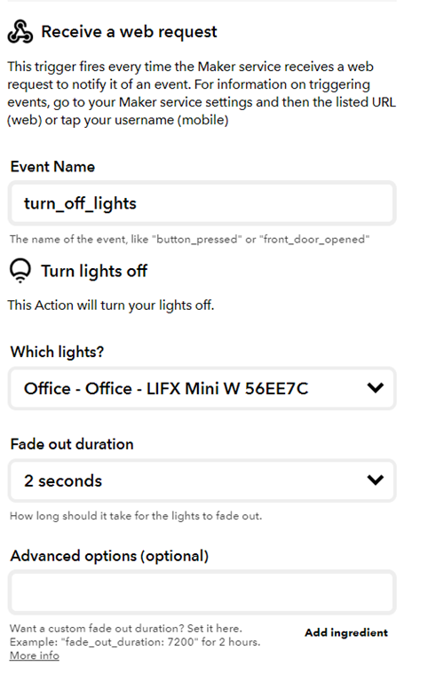 I created two applets. One to turn the light on and one to turn it off. For the trigger, I used a webhook and named the event “turn_off_lights.” For the action I used the LIFX action and configured it to “Turn lights off”. Then I set which bulb to turn off and set it to a 2 second fade.
