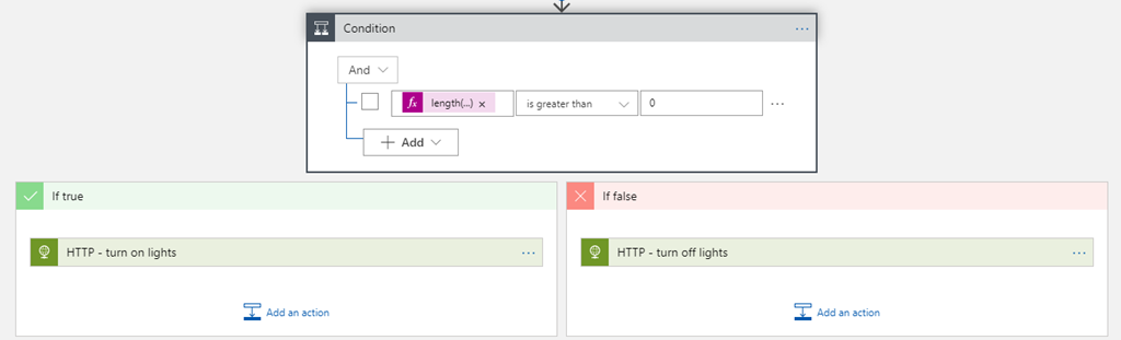 is greater than 0. If it is, that means we found a busy calendar event happening right now and we turn the light on. If not, we turn the light off. The two HTTP activities simply POST to my webhooks I created earlier.