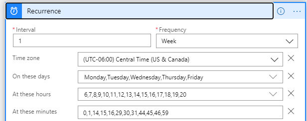 This way it will run Mon-Fri on the hours of 6am-10pm central time and only trigger every 15 minutes plus the minute before and after. My meetings usually start on 15 minute intervals, so the trigger will run just before and after the start and end of every possible meeting.