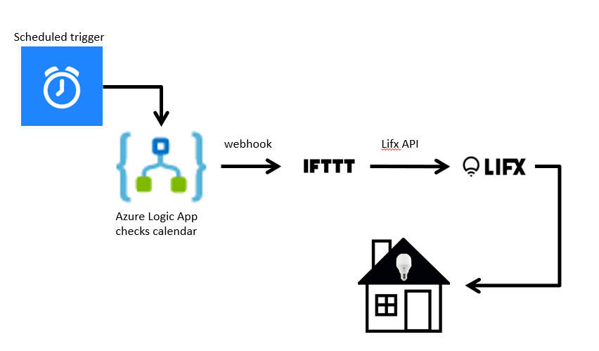 LIFX provides an API which I could call directly using an Azure function, but I wanted to do this with as little code as possible. Azure Logic Apps has integration to my O365 calendar, but doesn’t have any default connectors to LIFX. IFTTT supports LIFX connectors but only supports “when an O365 event is about to start” which helps me turn on the bulb, but not turn it off when the meeting finishes.
